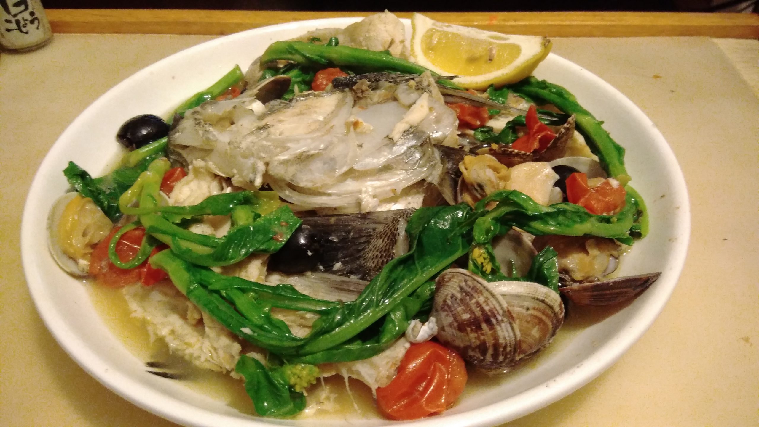 江戸川方面で釣ったシーバスのアラと掘ったアサリ、野川で摘んだ菜の花でアクアパッツアを作った。シーバスは釣ってすぐシメた。アラは調理前に熱湯をかけて臭みを多少は取ったつもり。そのかいあってか心配していたシーバスの臭みは殆どない。普通に食えた。捌いた後牛乳に一晩漬けておけば臭み対策は万全だろうが、そこまでやらなくても大丈夫だった。